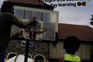 配文写道:“从足球训练迅速切换到了篮球,忙碌的学习日。”