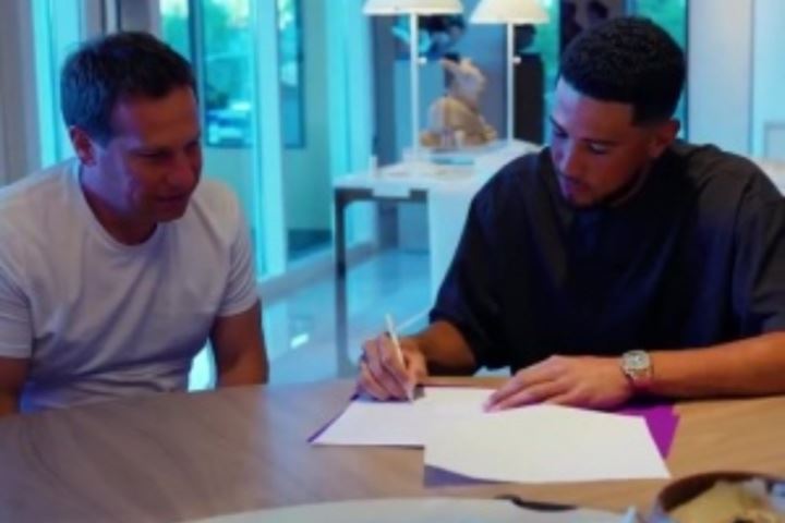 2年1.45亿!布克续约NBA最高年薪合同 老板伊什比亚在旁笑得勉强~