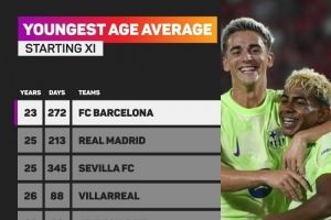西甲首轮最年轻首发阵容:巴萨23岁272天居首,皇马25岁213天次席