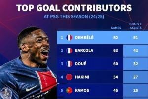 本赛季巴黎队内参与进球榜:登贝莱51球居首,巴尔科拉42球次席